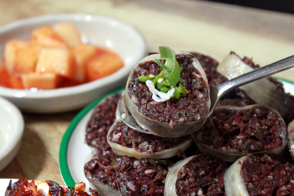 선지 함량이 높아 순대색이 어두운 편이고, 고소함이 특징이다.