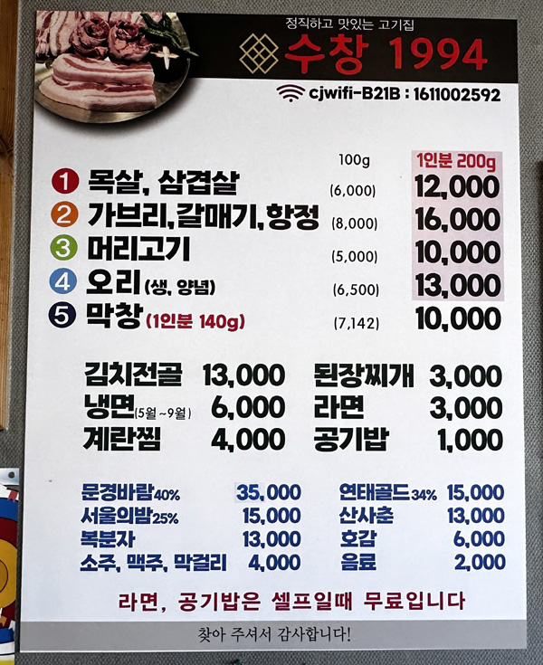 1번 목살·삼겹살, 2번 가브리·갈매기·항정살, 3번 머리고기, 4번 오리, 5번 막창이다.