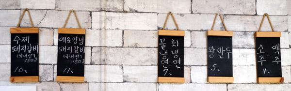 수제 돼지갈비, 매운양념 돼지갈비, 물냉면, 회냉면, 왕만두 등의 메뉴가 있다.