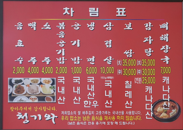 감자탕, 뼈다귀해장국, 보쌈, 삼겹살, 소머리국밥 요리와 특별메뉴인 한우불고기가 있다.